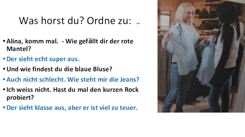 Was horst du? Ordne zu: lb38Alina, komm mal. - Wie gefӓllt dir der rote Mantel?Der sieht echt