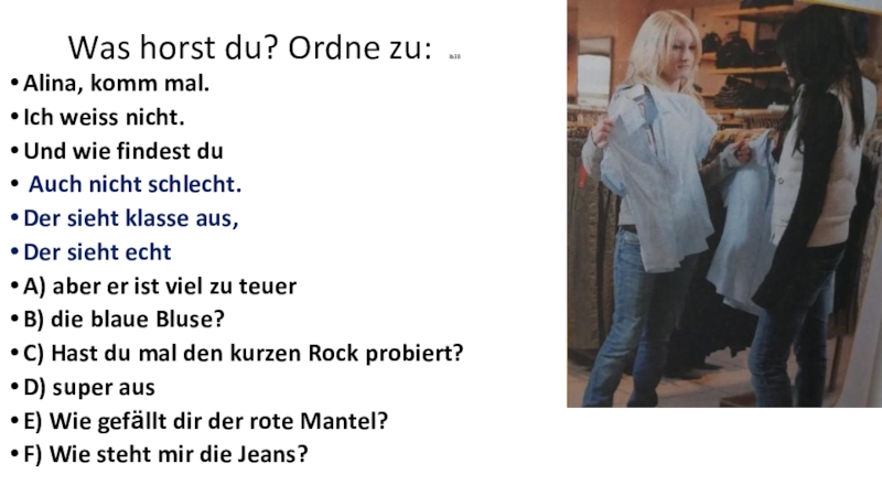 Was horst du? Ordne zu: lb38Alina, komm mal. Ich weiss nicht. Und wie findest du Auch nicht schlecht. Der sieht klasse aus, Der sieht echt A) aber er ist viel zu teuerB) die blaue Bluse?C) Hast
