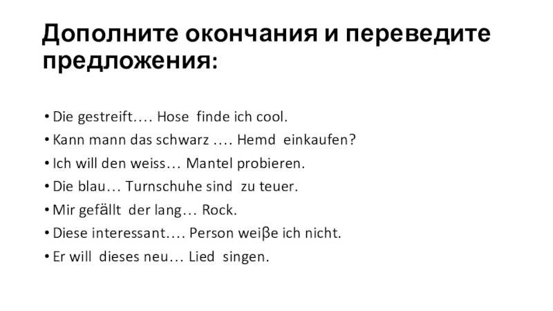 Дополните окончания и переведите предложения: Die gestreift…. Hose finde ich cool.Kann mann das schwarz …. Hemd einkaufen?Ich