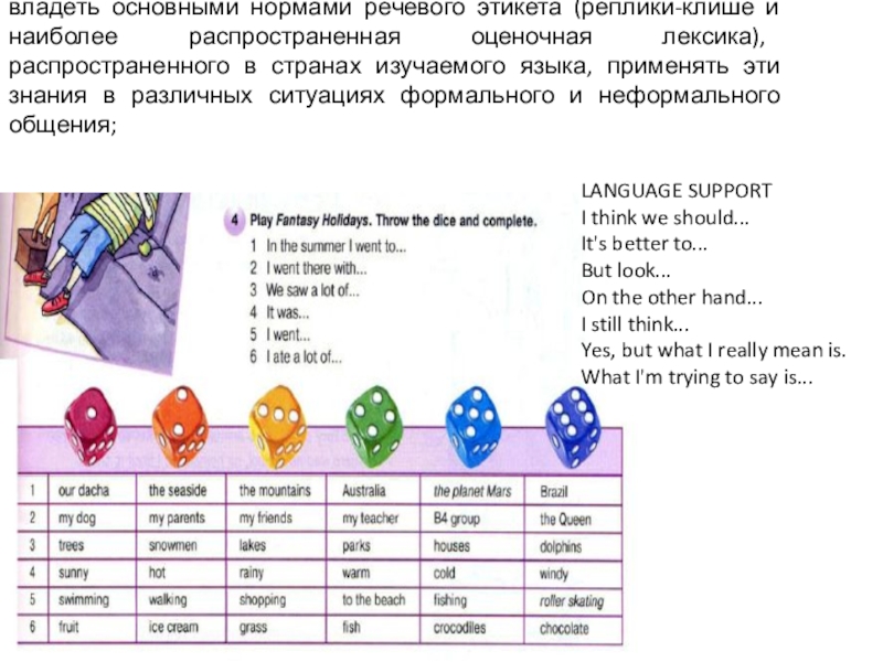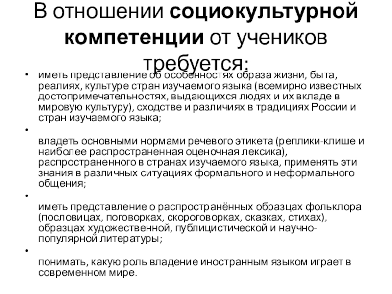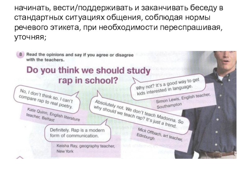 владеть основными нормами речевого этикета (реплики-клише и наиболее распространенная оценочная лексика), распространенного в странах изучаемого языка, применять эти знания в различных ситуациях формального и неформального общения;