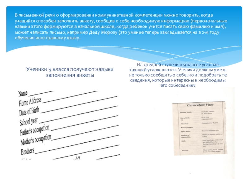 На средней ступени в 9 классе условия заданий усложняются. Ученики должны уметь не только сообщить о себе, но и подобрать те сведения, которые интересны и необходимы его собеседнику