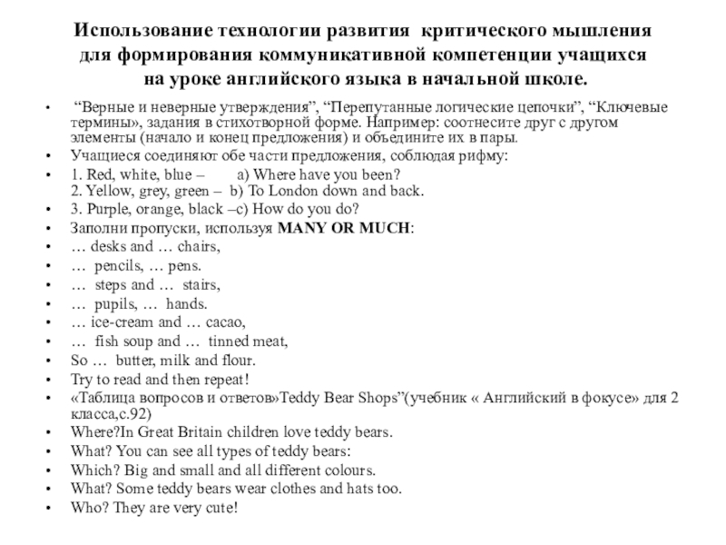 «Таблица вопросов и ответов»Teddy Bear Shops”(учебник « Английский в фокусе» для 2 класса,с.92)