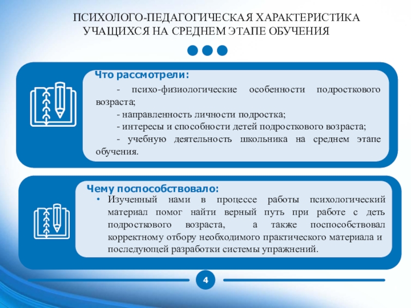 Изученный нами в процессе работы психологический материал помог найти верный путь при работе с деть подросткового возраста, а также поспособствовал корректному отбору необходимого практического материала и последующей разработки системы упражнений.