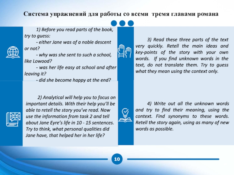 2) Analytical will help you to focus on important details. With their help you’ll be able to retell the story you’ve read. Now use the information from task 2 and tell about Jane Eyre’s life in 10 - 15 sentences. Try to think, what personal qualities did Jane have, that helped her in her life?