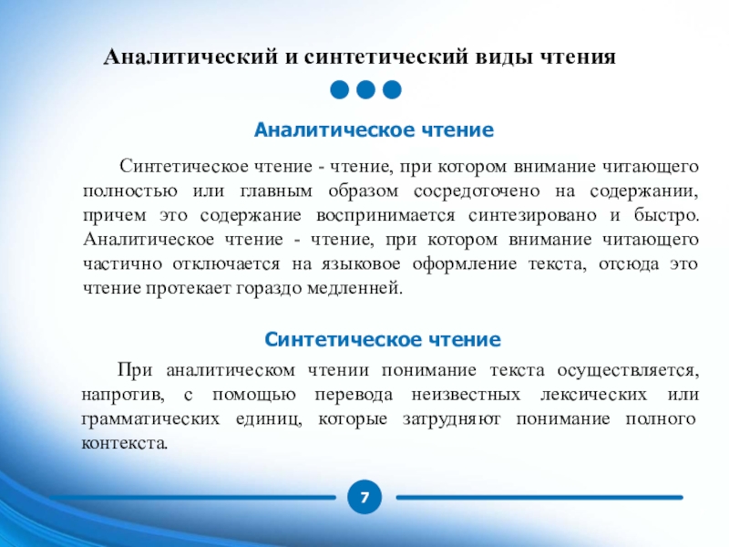 При аналитическом чтении понимание текста осуществляется, напротив, с помощью перевода неизвестных лексических или грамматических единиц, которые затрудняют понимание полного контекста.