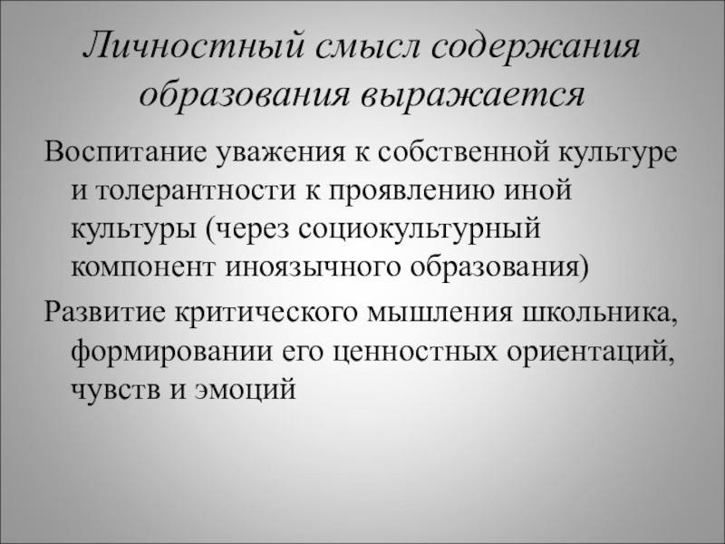 лингвистических представлений об иностранном языке в условиях взаимосвязи с родным (лингвистический компонент); сформированность толерантности к носителям чужого языка (социокультурный компонент)