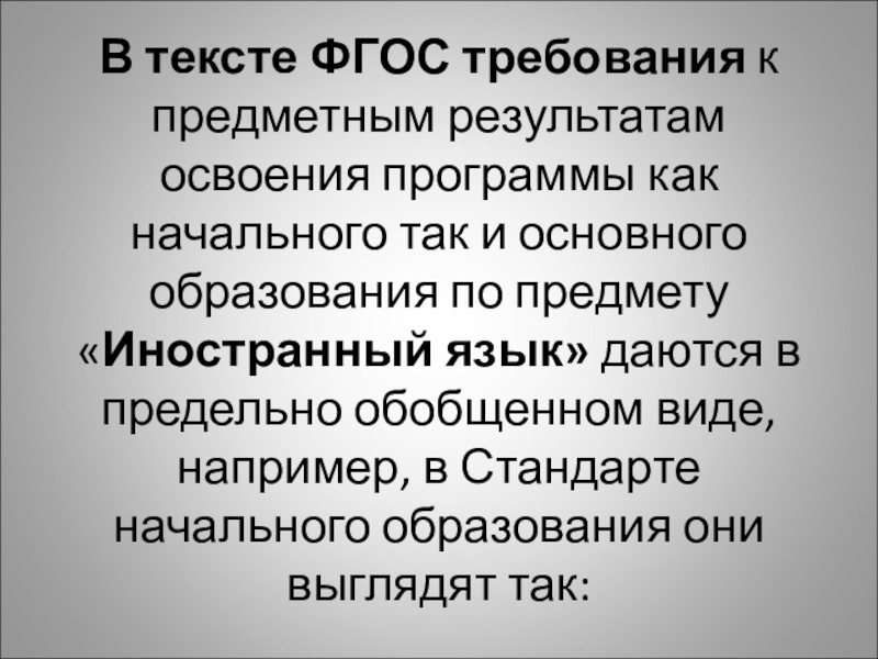 так и основного образования по предмету «Иностранный язык» даются в предельно обобщенном виде, например, в Стандарте начального образования они выглядят так: