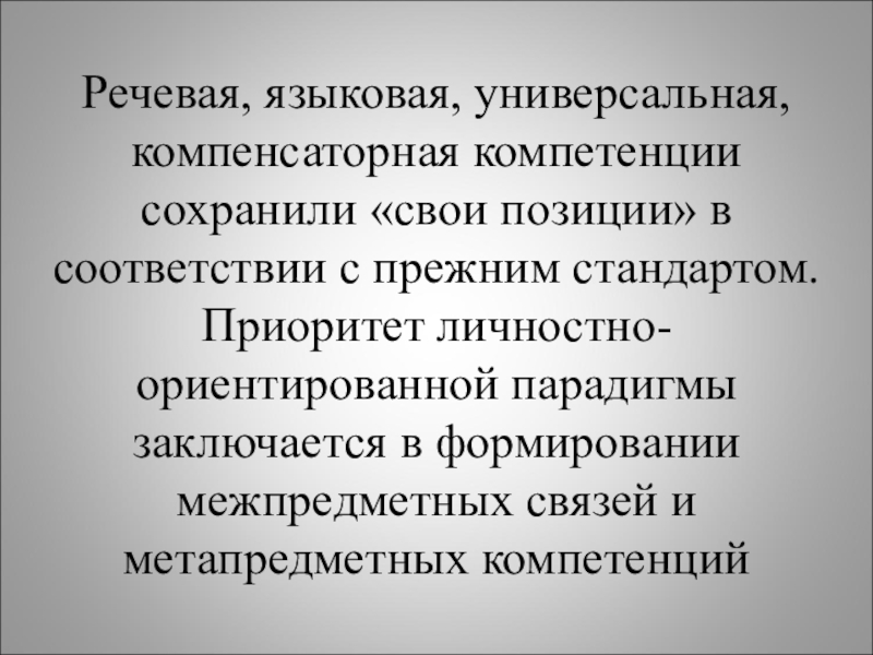 Слайд 8Речевая, языковая, универсальная, компенсаторная компетенции сохранили «свои позиции» в соответствии с