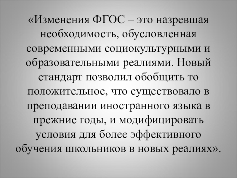 реалиями. Новый стандарт позволил обобщить то положительное, что существовало в преподавании иностранного языка в прежние годы, и модифицировать условия для более эффективного обучения школьников в новых реалиях».