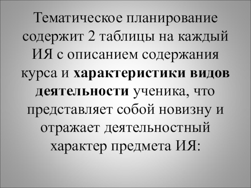 Слайд 24Тематическое планирование содержит 2 таблицы на каждый ИЯ с описанием содержания