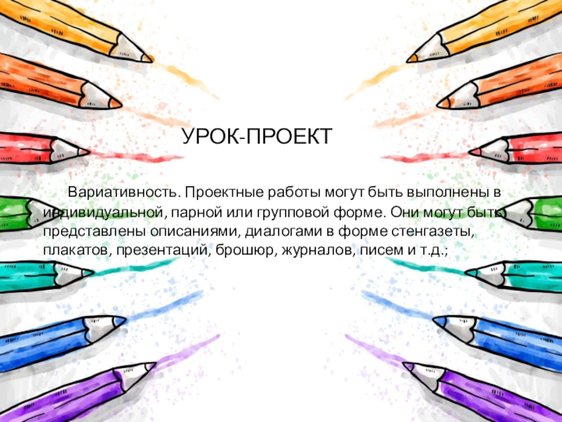 Вариативность. Проектные работы могут быть выполнены в индивидуальной, парной или групповой форме. Они могут быть представлены описаниями, диалогами в форме стенгазеты, плакатов, презентаций, брошюр, журналов, писем и т.д.;