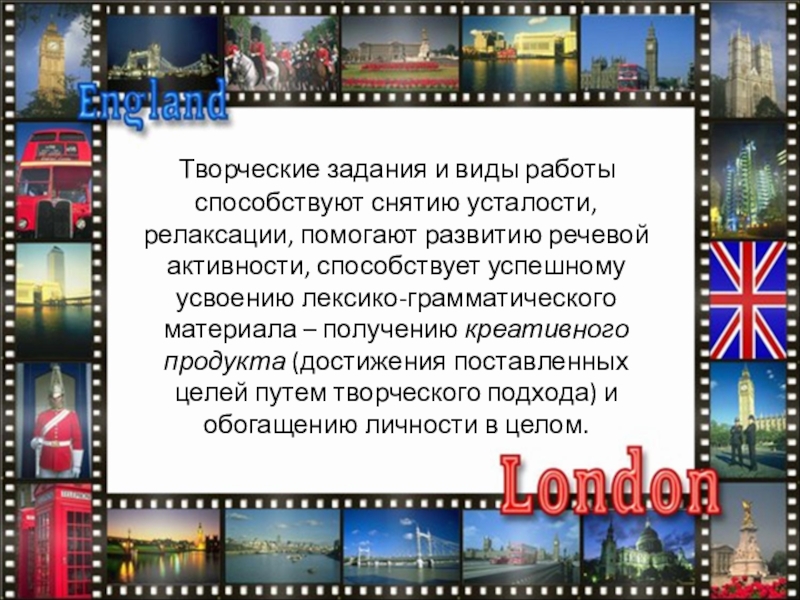 помогают развитию речевой активности, способствует успешному усвоению лексико-грамматического материала – получению креативного продукта (достижения поставленных целей путем творческого подхода) и обогащению личности в целом.