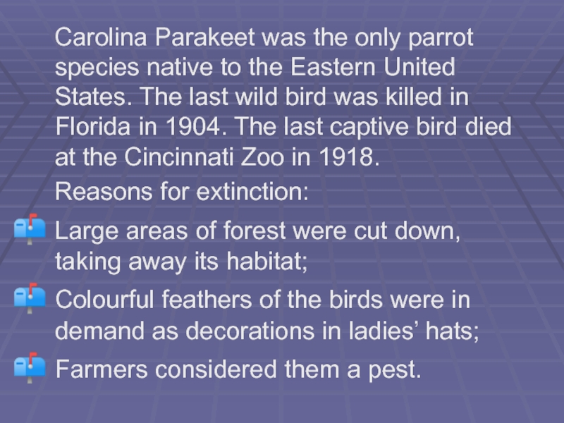 Слайд 14 Carolina Parakeet was the only parrot species native to