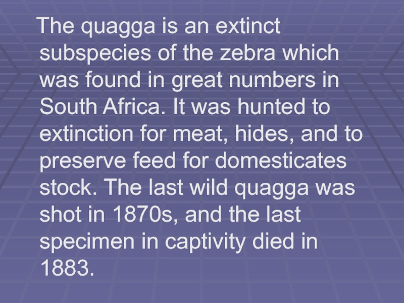 Слайд 12 The quagga is an extinct subspecies of the zebra which