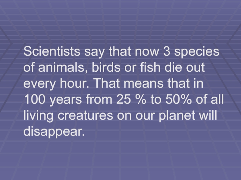 or fish die out every hour. That means that in 100 years from 25 % to 50% of all living creatures on our planet will disappear.