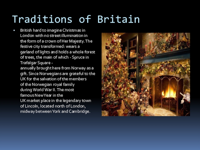 Her Majesty. The festive city transformed: wears a garland of lights and holds a whole forest of trees, the main of which - Spruce in Trafalgar Square - annually brought here from Norway as a gift. Since Norwegians are grateful to the UK for the salvation of the members of the Norwegian royal family during World War II. The most famous New Year in the UK market place in the legendary town of Lincoln, located north of London, midway between York and Cambridge.