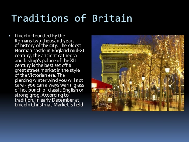 Traditions of BritainLincoln -founded by the Romans two thousand years of history of the city. The oldest Norman castle in England mid-XI century, the ancient cathedral and bishop's