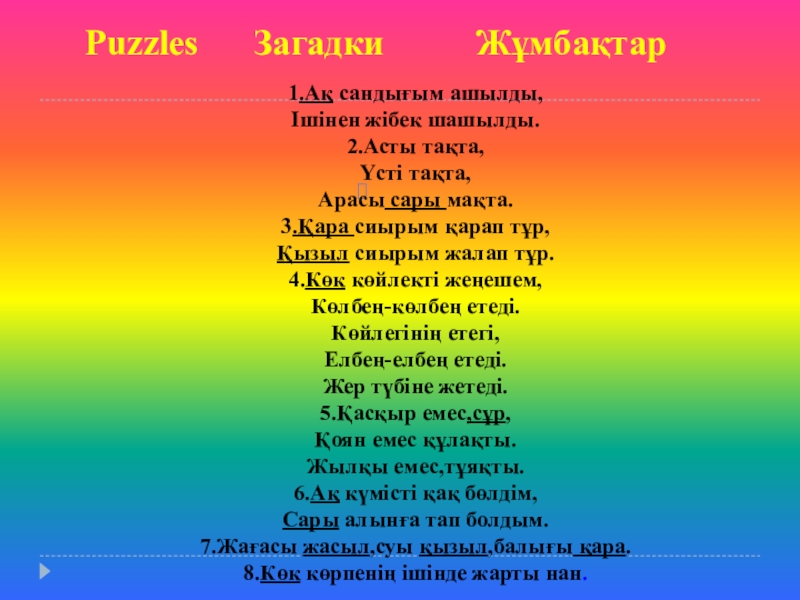 7.Жағасы жасыл,суы қызыл,балығы қара.