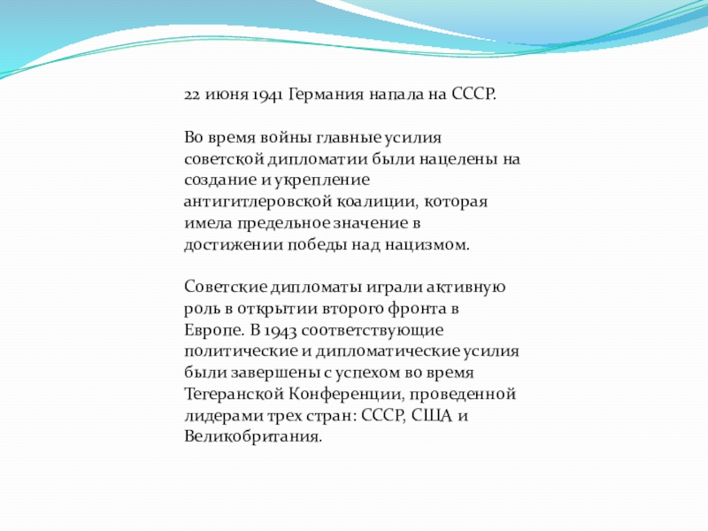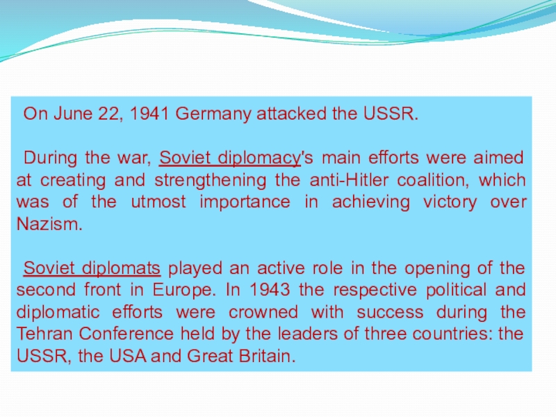 Soviet diplomats played an active role in the opening of the second front in Europe. In 1943 the respective political and diplomatic efforts were crowned with success during the Tehran Conference held by the leaders of three countries: the USSR, the USA and Great Britain.