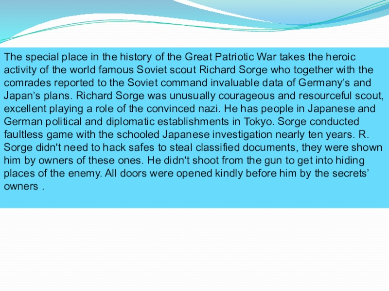 takes the heroic activity of the world famous Soviet scout Richard Sorge who together with the comrades reported to the Soviet command invaluable data of Germany’s and Japan’s plans. Richard Sorge was unusually courageous and resourceful scout, excellent playing a role of the convinced nazi. He has people in Japanese and German political and diplomatic establishments in Tokyo. Sorge conducted faultless game with the schooled Japanese investigation nearly ten years. R. Sorge didn't need to hack safes to steal classified documents, they were shown him by owners of these ones. He didn't shoot from the gun to get into hiding places of the enemy. All doors were opened kindly before him by the secrets’ owners .