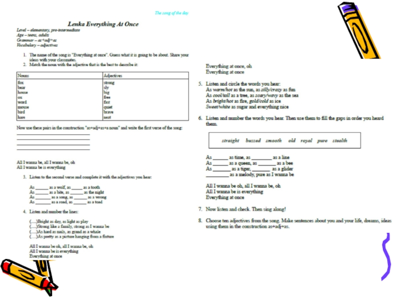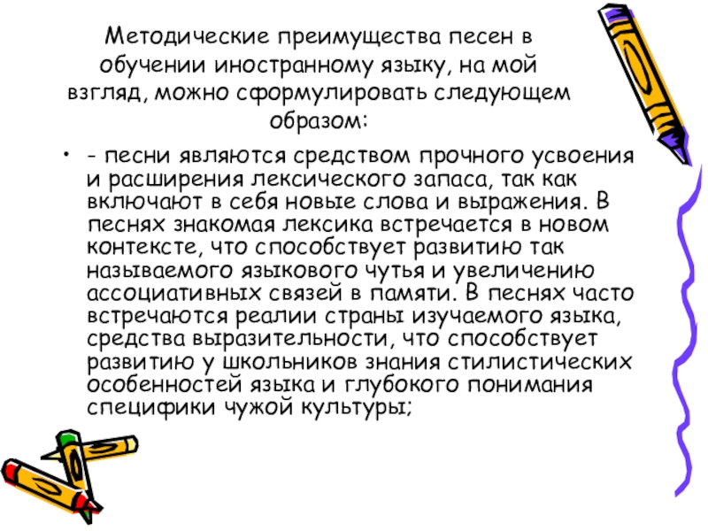 - песни являются средством прочного усвоения и расширения лексического запаса, так как включают в себя новые слова и выражения. В песнях знакомая лексика встречается в новом контексте, что способствует развитию так называемого языкового чутья и увеличению ассоциативных связей в памяти. В песнях часто встречаются реалии страны изучаемого языка, средства выразительности, что способствует развитию у школьников знания стилистических особенностей языка и глубокого понимания специфики чужой культуры;