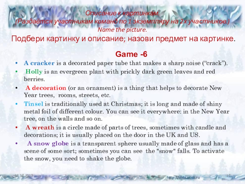 Tinsel is traditionally used at Christmas; it is long and made of shiny metal foil of different colour. You can see it everywhere: in the New Year tree, on the walls and so on.