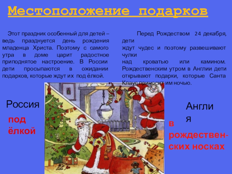 Этот праздник особенный для детей – ведь празднуется день рождения младенца Христа. Поэтому с самого утра в доме царит радостное приподнятое настроение. В России дети просыпаются в ожидании подарков, которые ждут их под ёлкой.