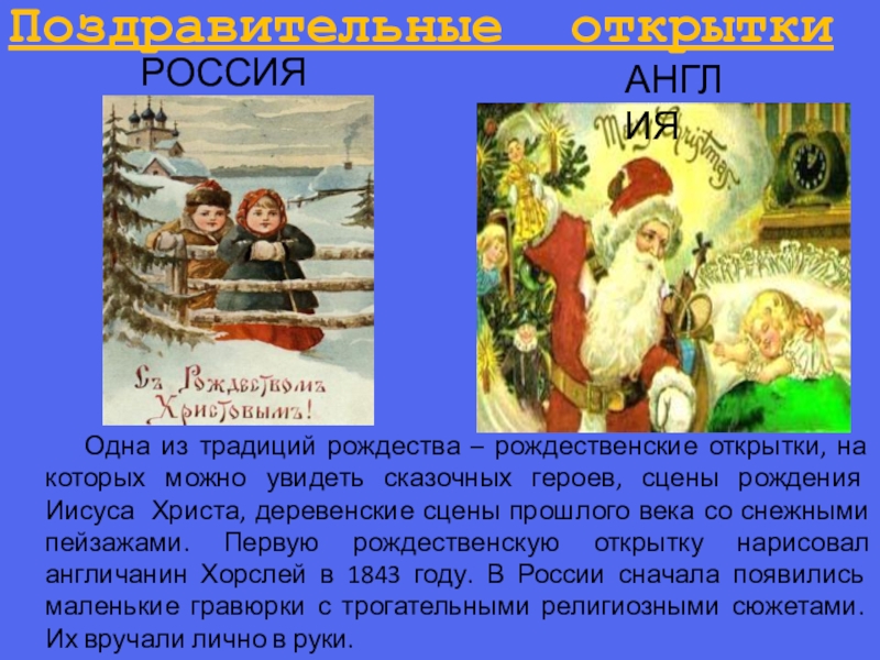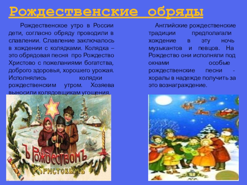Английские рождественские традиции предполагали хождение в эту ночь музыкантов и певцов. На Рождество они исполняли под окнами особые рождественские песни - хоралы в надежде получить за это вознаграждение.