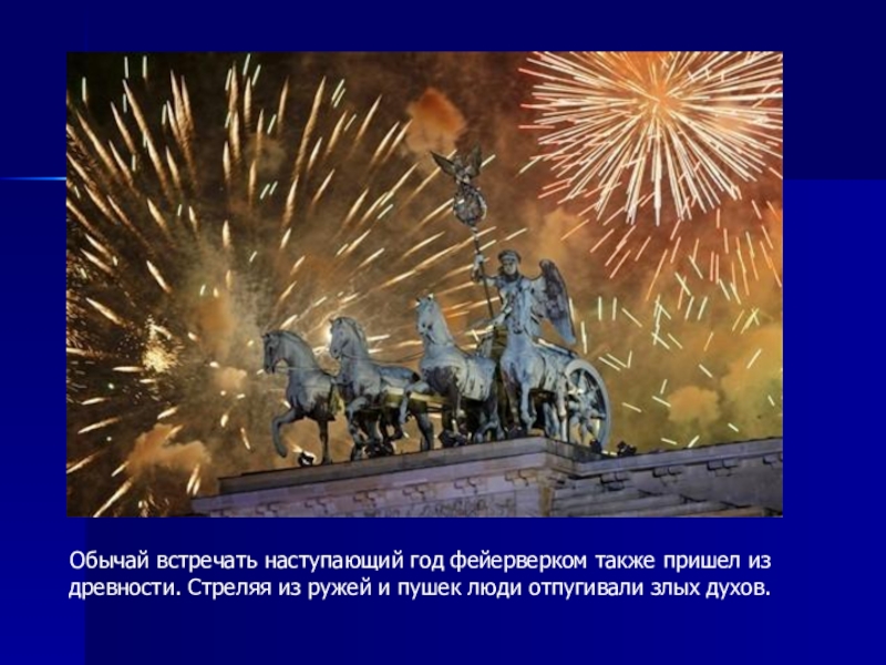 Слайд 16Обычай встречать наступающий год фейерверком также пришел из древности. Стреляя из