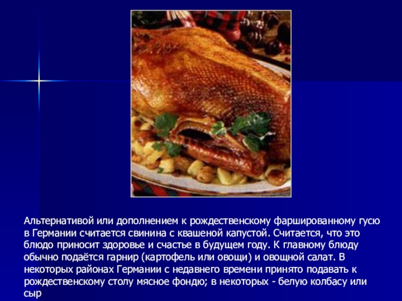 Слайд 22Альтернативой или дополнением к рождественскому фаршированному гусю в Германии считается свинина