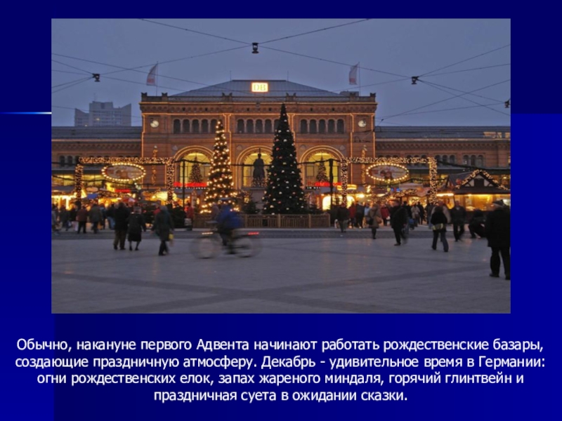 Слайд 11Обычно, накануне первого Адвента начинают работать рождественские базары, создающие праздничную атмосферу.