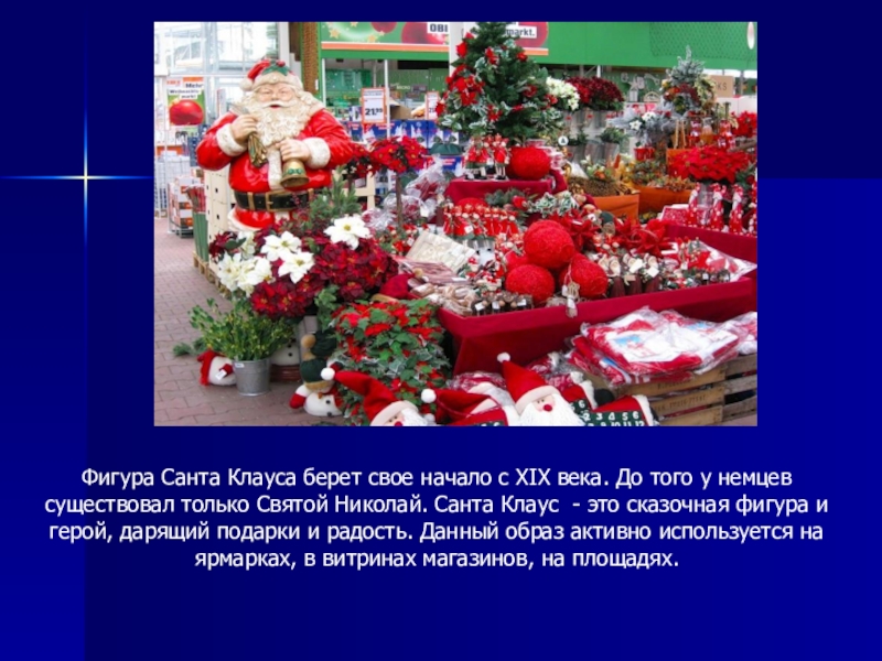 у немцев существовал только Святой Николай. Санта Клаус - это сказочная фигура и герой, дарящий подарки и радость. Данный образ активно используется на ярмарках, в витринах магазинов, на площадях.
