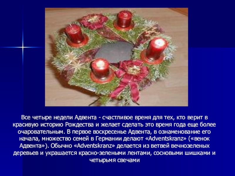 в красивую историю Рождества и желает сделать это время года еще более очаровательным. В первое воскресенье Адвента, в ознаменование его начала, множество семей в Германии делают «Adventskranz» («венок Адвента»). Обычно «Adventskranz» делается из ветвей вечнозеленых деревьев и украшается красно-зелеными лентами, сосновыми шишками и четырьмя свечами