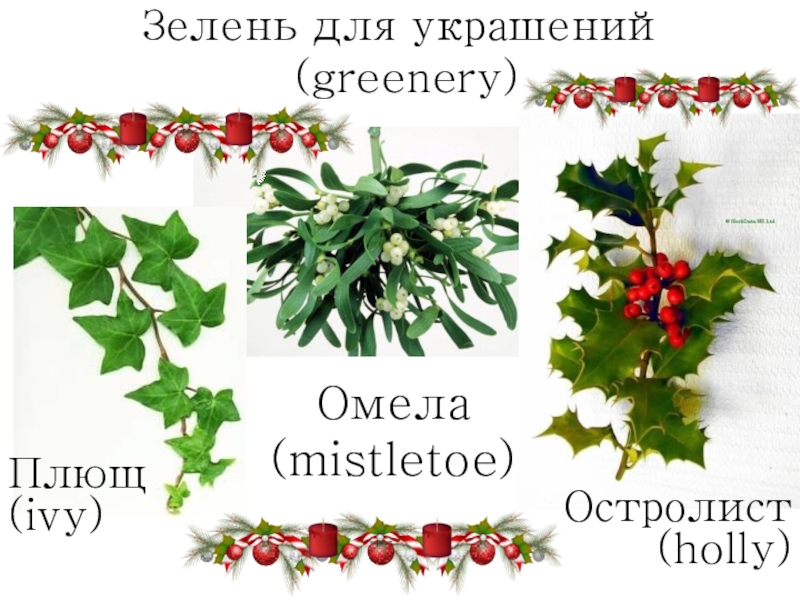 Зелень для украшений  (greenery)Остролист (holly)Омела (mistletoe)Плющ (ivy)