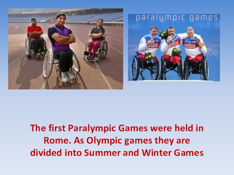 The first Paralympic Games were held in Rome. As Olympic games they are divided into Summer and Winter Games