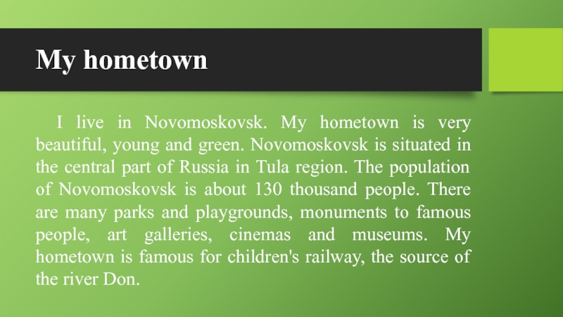 and green. Novomoskovsk is situated in the central part of Russia in Tula region. The population of Novomoskovsk is about 130 thousand people. There are many parks and playgrounds, monuments to famous people, art galleries, cinemas and museums. My hometown is famous for children's railway, the source of the river Don.