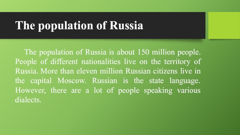 million people. People of different nationalities live on the territory of Russia. More than eleven million Russian citizens live in the capital Moscow. Russian is the state language. However, there are a lot of people speaking various dialects.