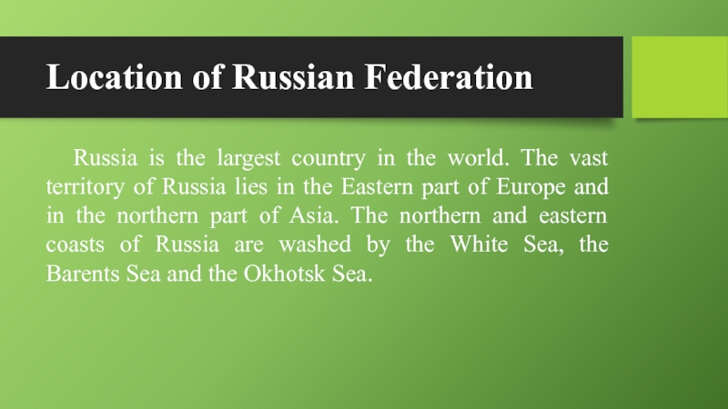 The vast territory of Russia lies in the Eastern part of Europe and in the northern part of Asia. The northern and eastern coasts of Russia are washed by the White Sea, the Barents Sea and the Okhotsk Sea.