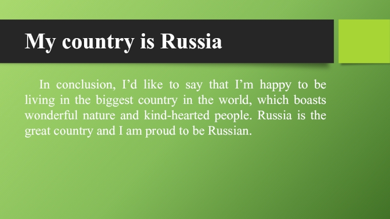 My country is Russia	In conclusion, I’d like to say that I’m happy to be living in the