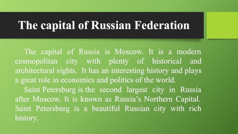 The capital of Russian Federation	The capital of Russia is Moscow. It is a modern cosmopolitan city with plenty