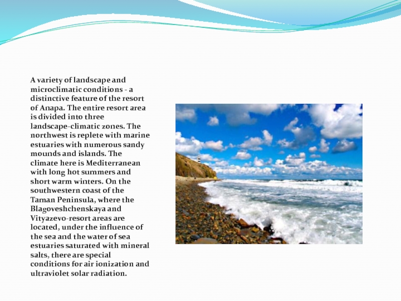 of the resort of Anapa. The entire resort area is divided into three landscape-climatic zones. The northwest is replete with marine estuaries with numerous sandy mounds and islands. The climate here is Mediterranean with long hot summers and short warm winters. On the southwestern coast of the Taman Peninsula, where the Blagoveshchenskaya and Vityazevo-resort areas are located, under the influence of the sea and the water of sea estuaries saturated with mineral salts, there are special conditions for air ionization and ultraviolet solar radiation.