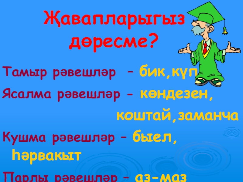 Җавапларыгыз дөресме?Тамыр рәвешләр – бик,күпЯсалма рәвешләр - көндезен,