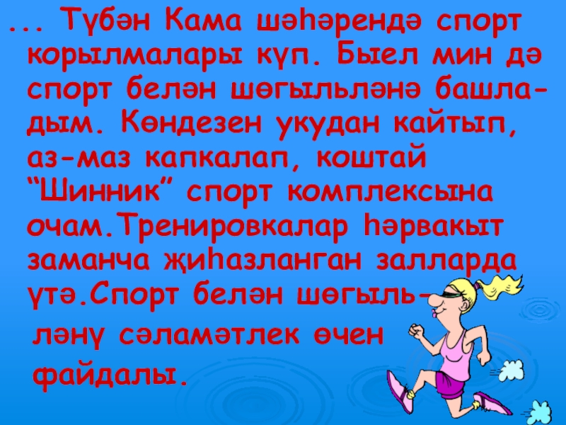 ... Түбән Кама шәһәрендә спорт корылмалары күп. Быел мин дә спорт белән шөгыльләнә башла- дым. Көндезен укудан