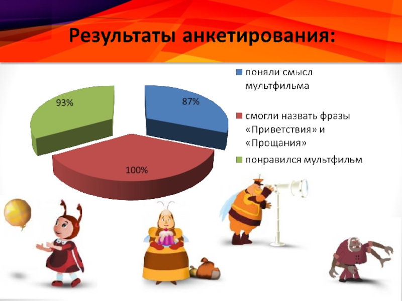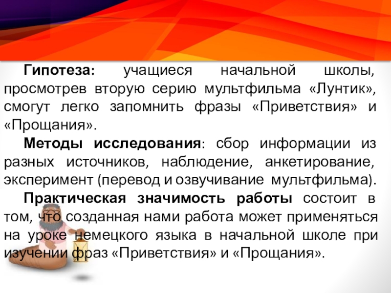 Нашему исследованию удалось вынести на поверхность данную проблему и подтвердить гипотезу: учащиеся начальной школы, просмотрев вторую серию мультфильма «Лунтик», смогли легко запомнить фразы «Приветствия» и «Прощания».