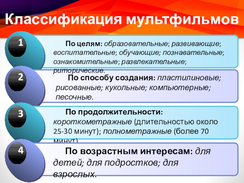 По целям: образовательные; развивающие; воспитательные; обучающие; познавательные; ознакомительные; развлекательные;