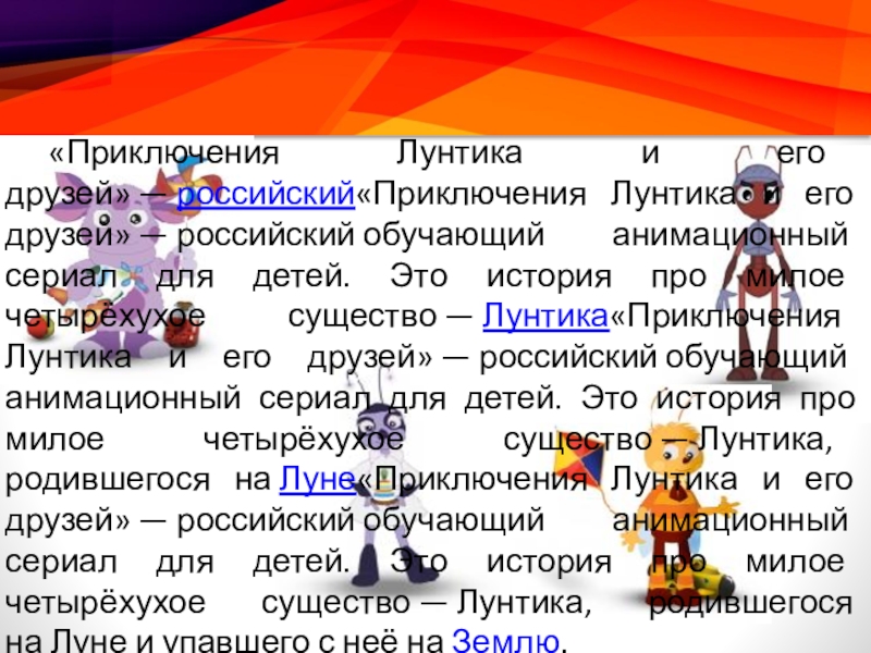 Слайд 10«Приключения Лунтика и его друзей» — российский«Приключения Лунтика и его друзей» — российский обучающий анимационный сериал