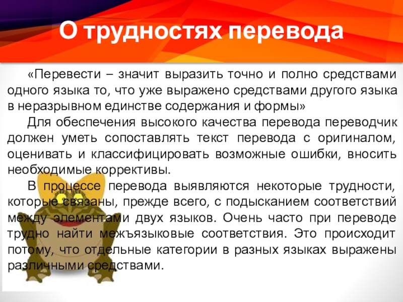 В процессе перевода выявляются некоторые трудности, которые связаны, прежде всего, с подысканием соответствий между элементами двух языков. Очень часто при переводе трудно найти межъязыковые соответствия. Это происходит потому, что отдельные категории в разных языках выражены различными средствами.