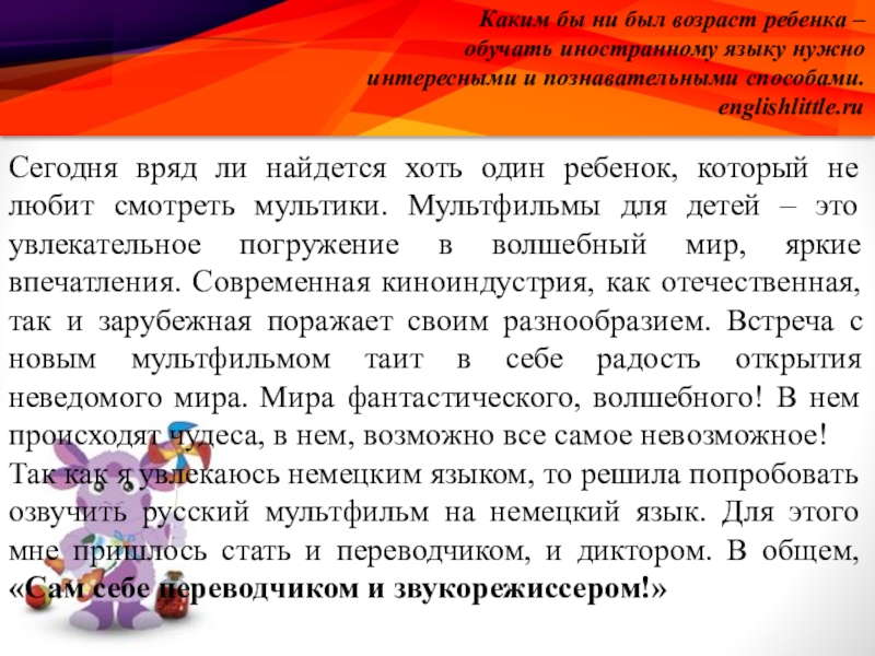 Так как я увлекаюсь немецким языком, то решила попробовать озвучить русский мультфильм на немецкий язык. Для этого мне пришлось стать и переводчиком, и диктором. В общем, «Сам себе переводчиком и звукорежиссером!»