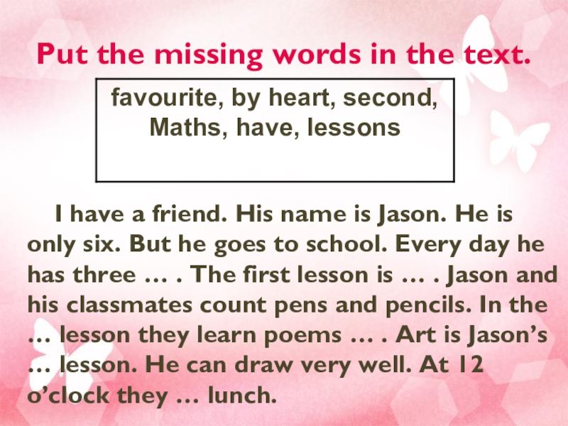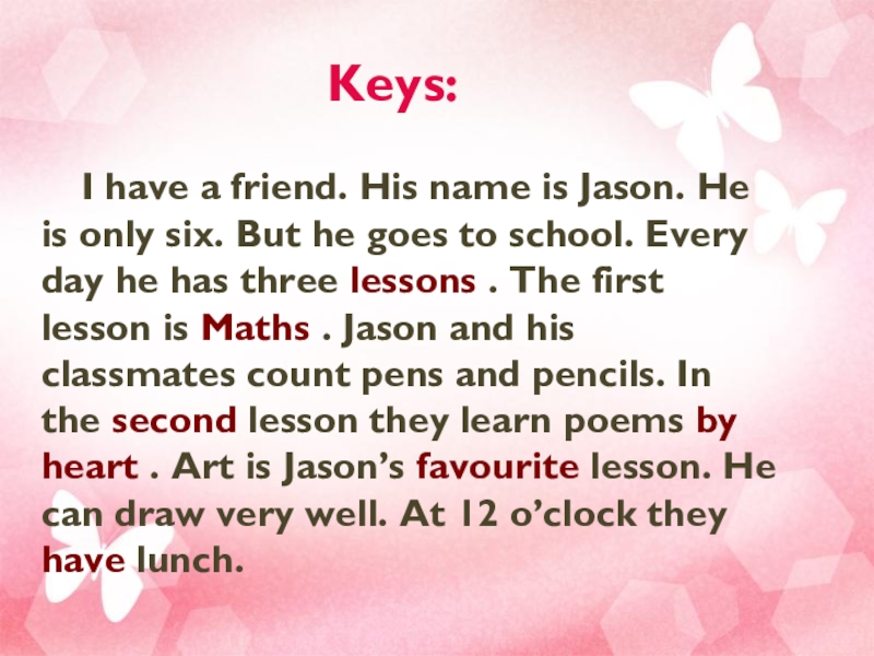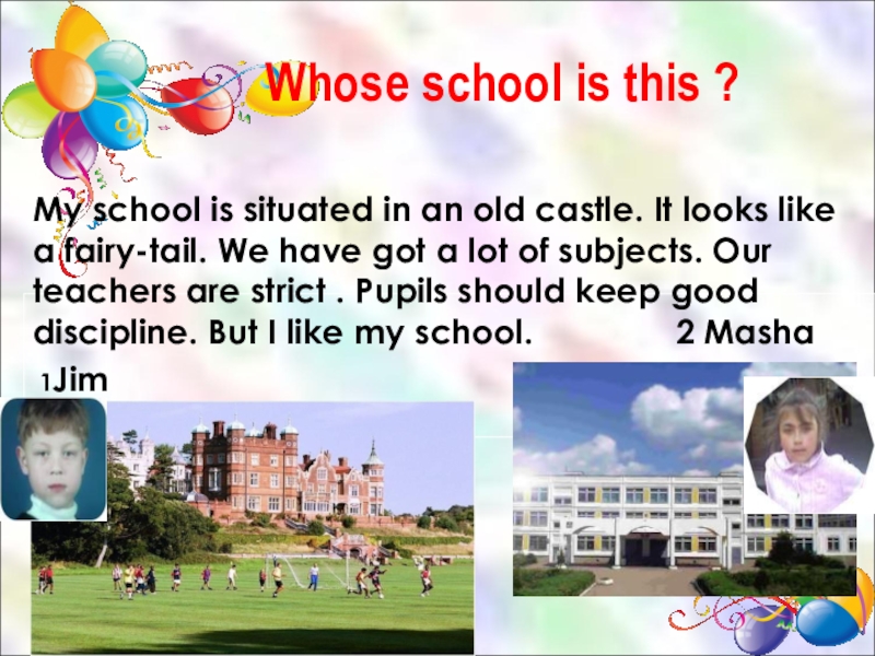 My school is situated in an old castle. It looks like a fairy-tail. We have got a lot of subjects. Our teachers are strict . Pupils should keep good discipline. But I like my school. 2 Masha