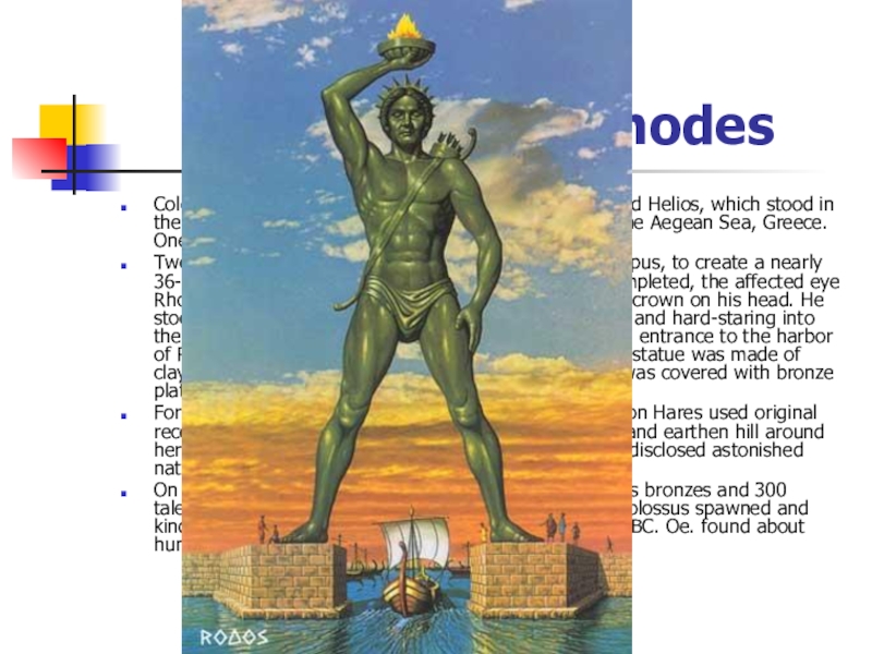 - a giant statue of the Greek sun god Helios, which stood in the port city of Rhodes, located on the same island in the Aegean Sea, Greece. One of the "Seven Wonders of the World."